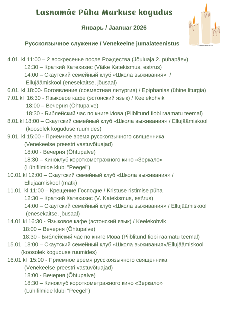 Meie koguduse 29. detsembri venekeelne missa (kell 11) ning 1. jaanuari Taizé palvus (kell 11) toimuvad erandkorras Linnamäe Vene Lütseumi saalis aadressil Linnamäe tee 10.